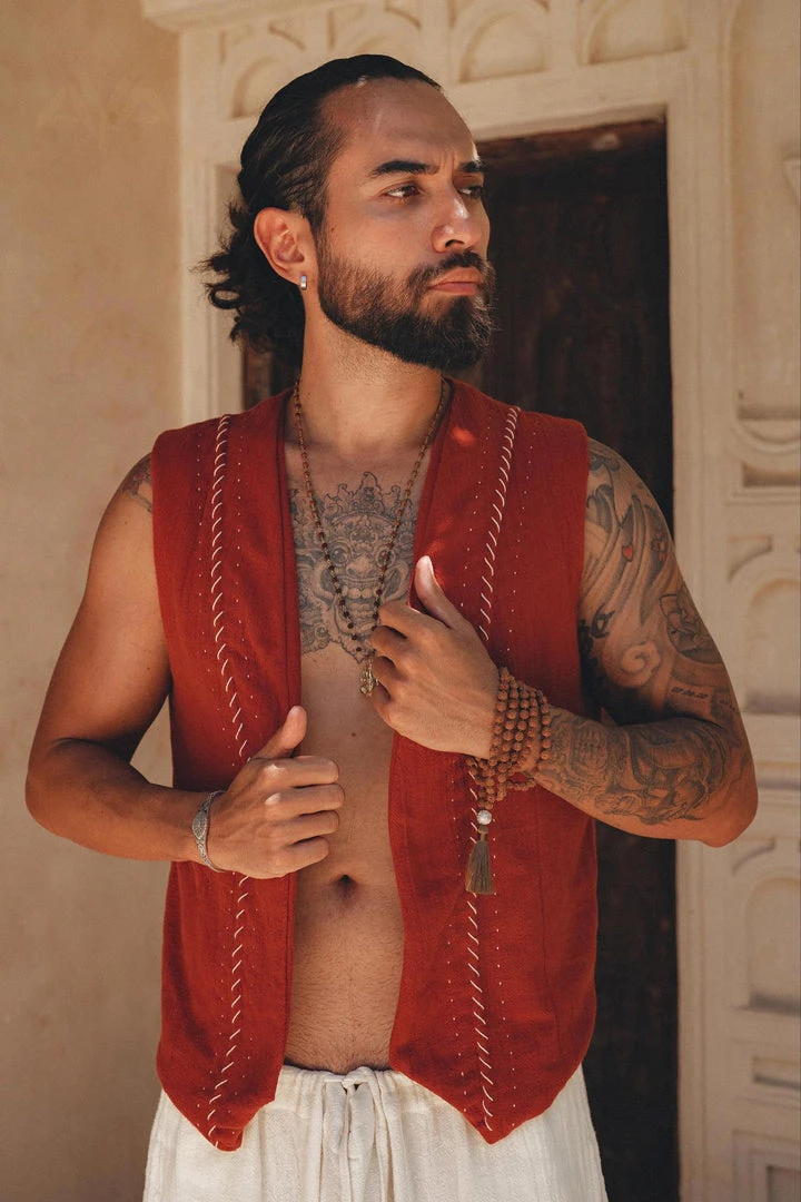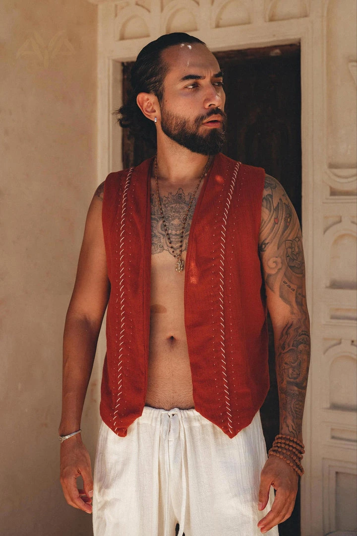 Red organic handwoven cotton vest for men.
