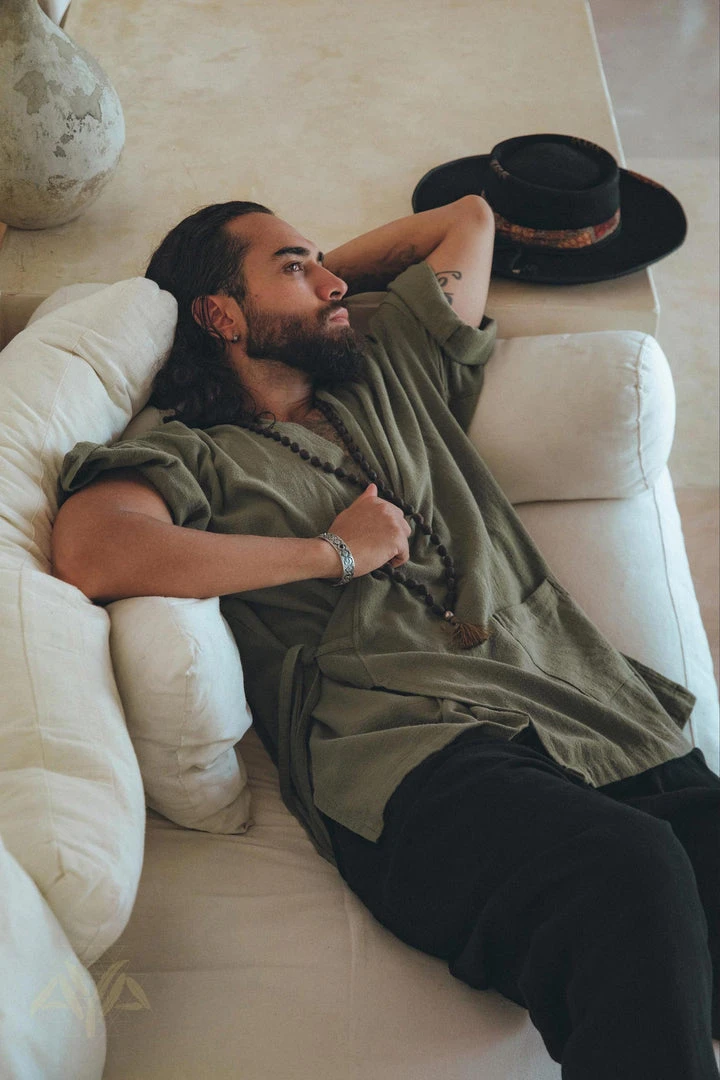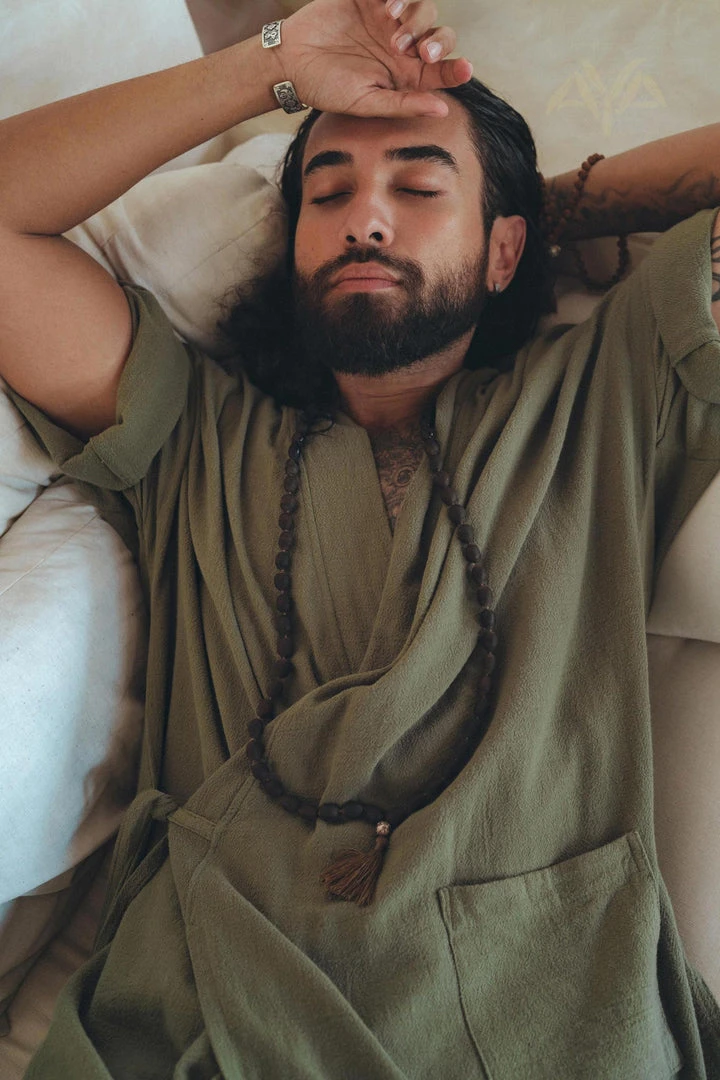 AYA’s sage dark green Tribal Kimono Robe is made of the highest quality handwoven cotton to reach the top of the comfort and unique stylish look.Â