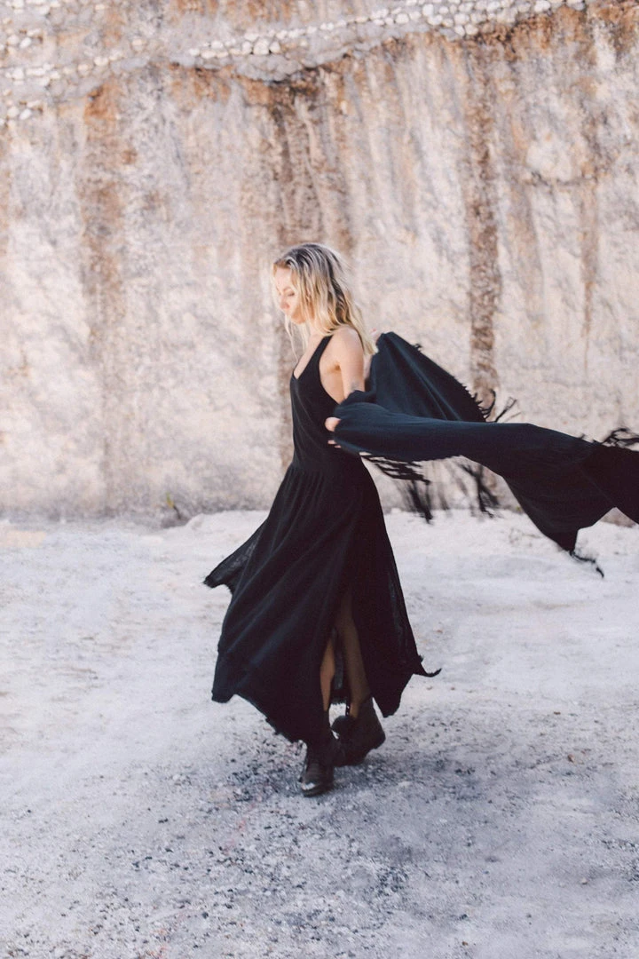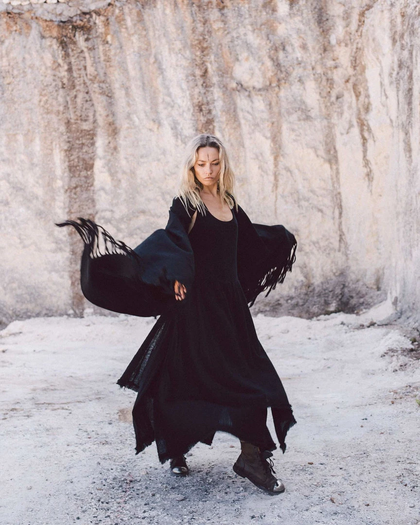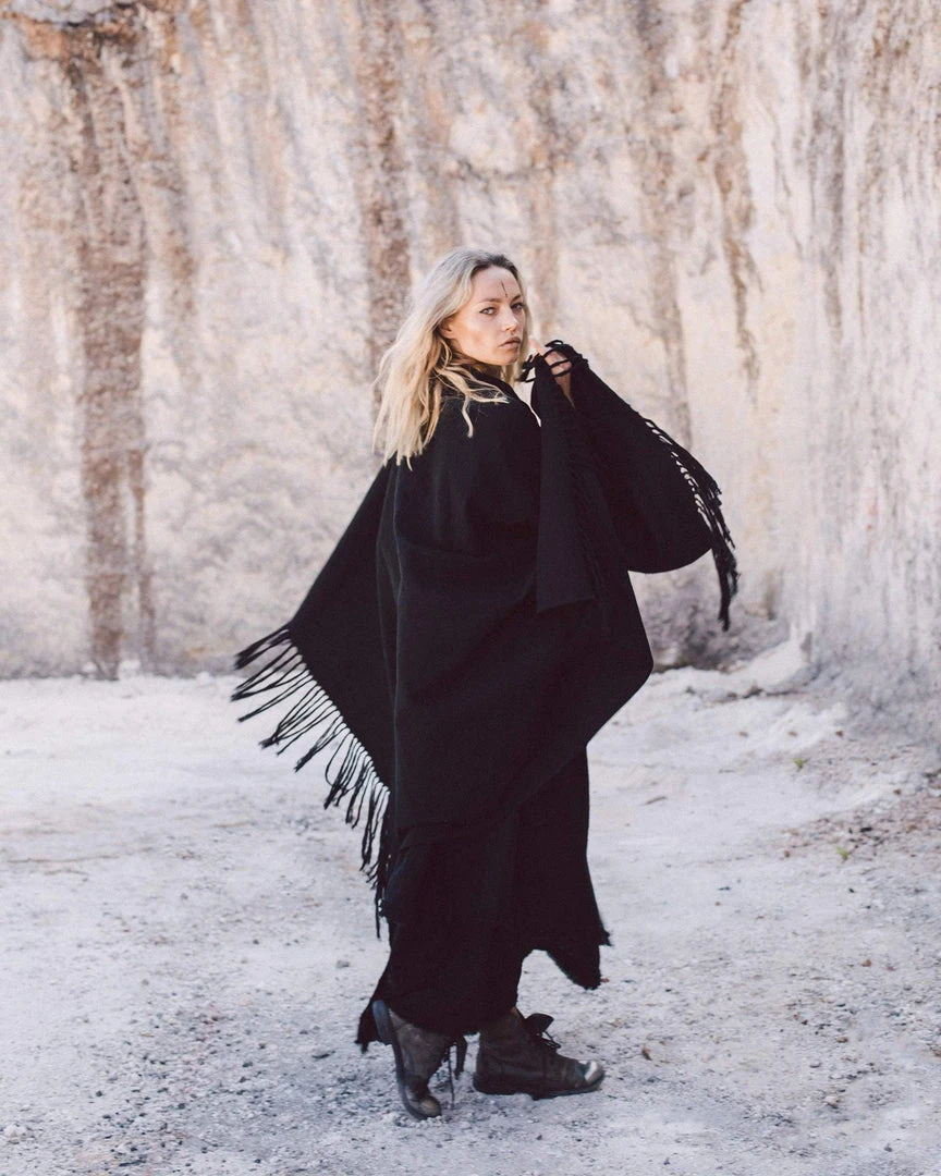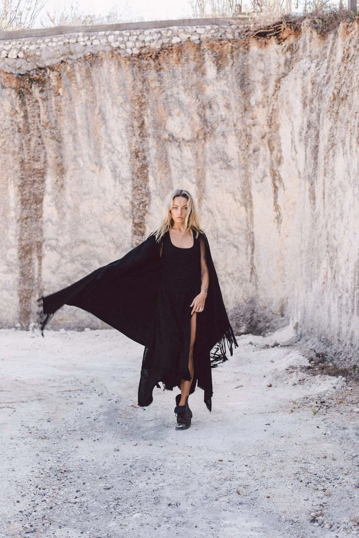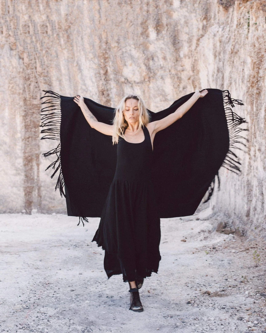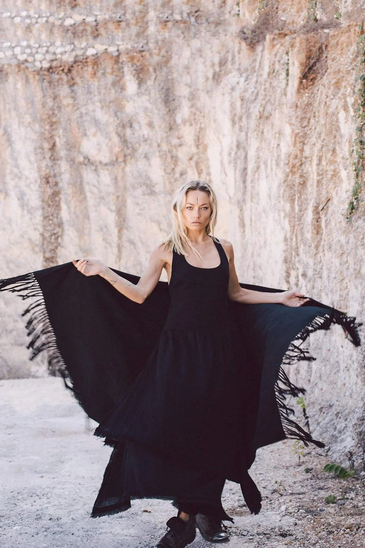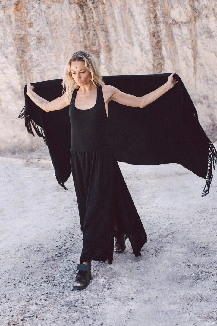 Handwoven organic cotton shawl (khadi), black long shawl with extremely long fringe. Super cozy, soft and comfortable.