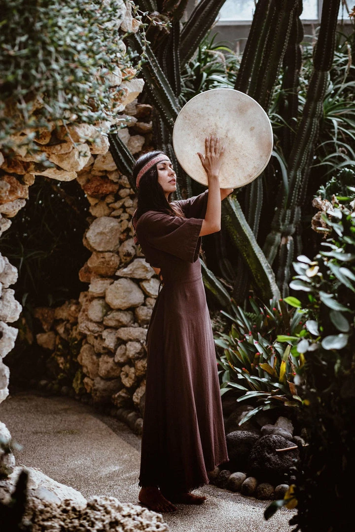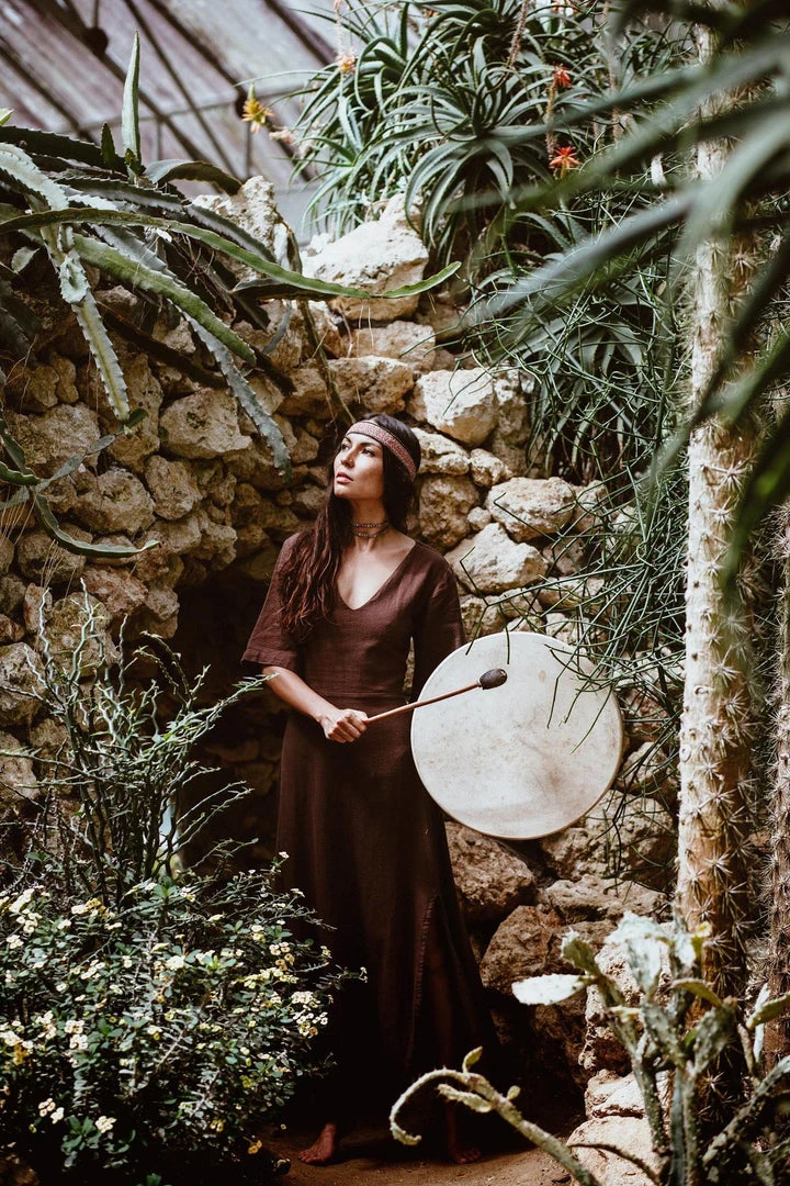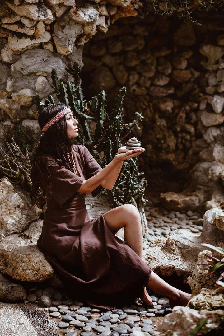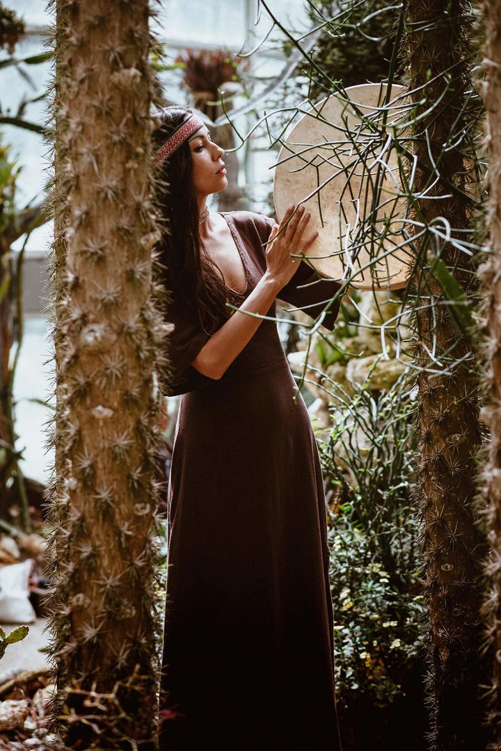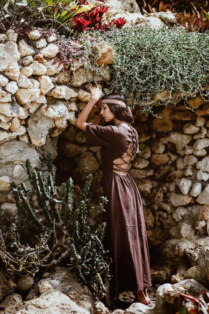 The “Cristal de Floresta” Brown dress is a stunning, bohemian maxi dress. Our boho bridesmaid dress features an open back, side slit, half sleeves and V shape neckline. The hem length of the skirt reaches ankle and has a raw decorative edge at the bottom.
