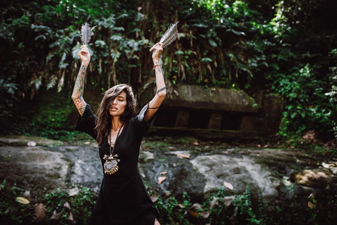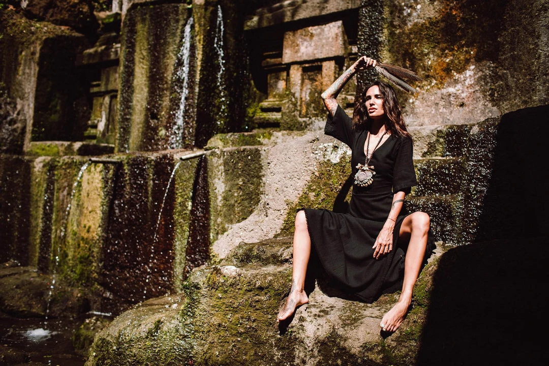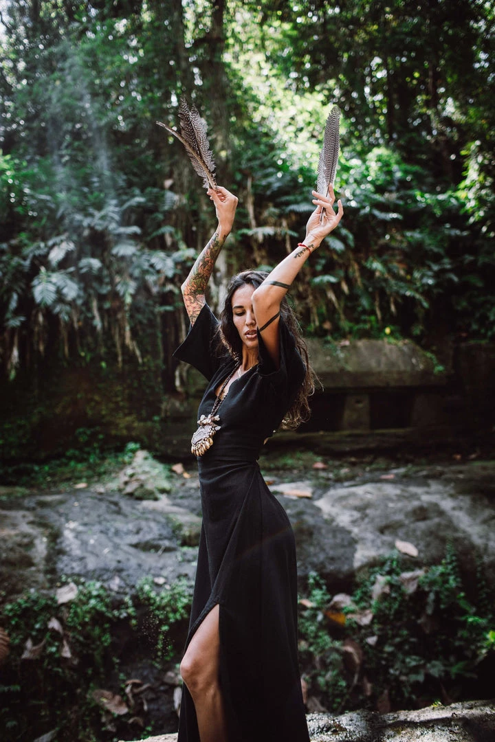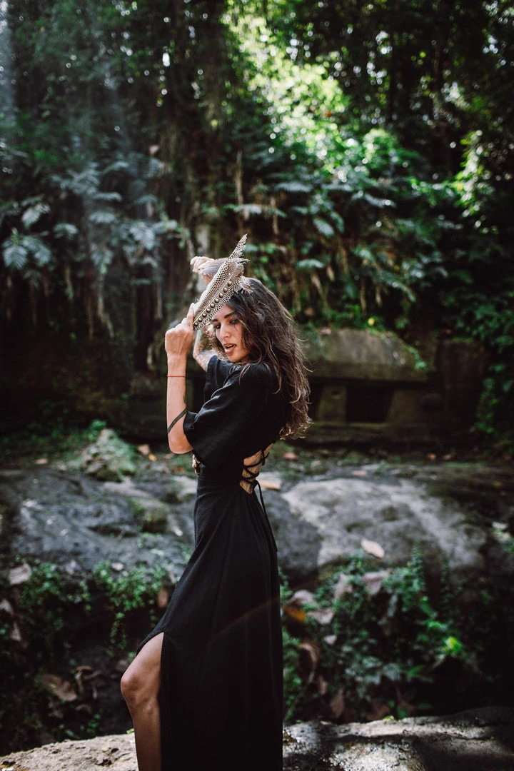 The “Cristal de Floresta” Black dress is a stunning, bohemian maxi dress. Our boho bridesmaid dress features an open back, side slit, half sleeves and V shape neckline. The hem length of the skirt reaches ankle and has a raw decorative edge at the bottom.