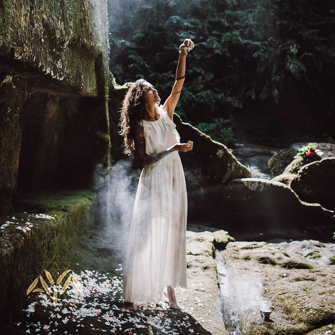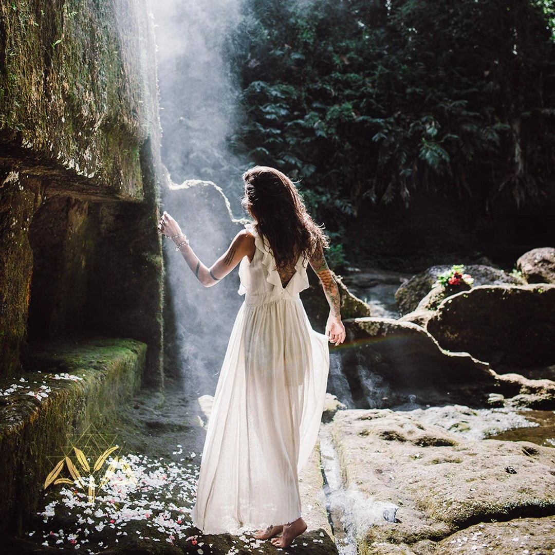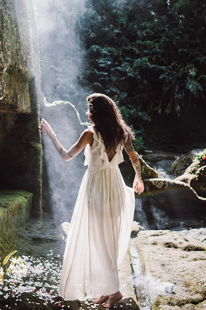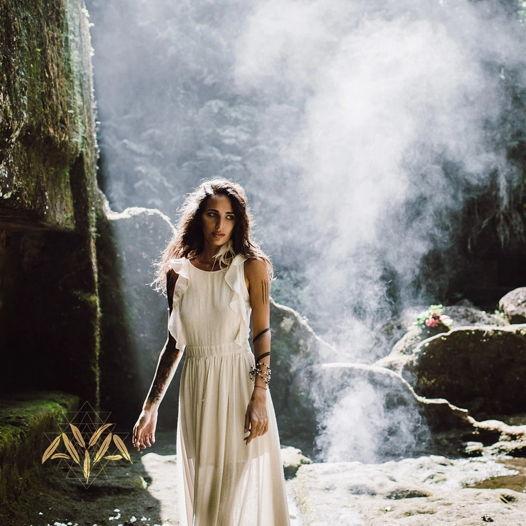 “Aloka” Goddess Dress – boho wedding dress (Aloka is Sanskrit for heavenly body) – is a form-fitting hand-loomed cotton dress with a v-back and sleeveless. It can be worn as a beach cover up, or as a long maxi dress for formal occasions.