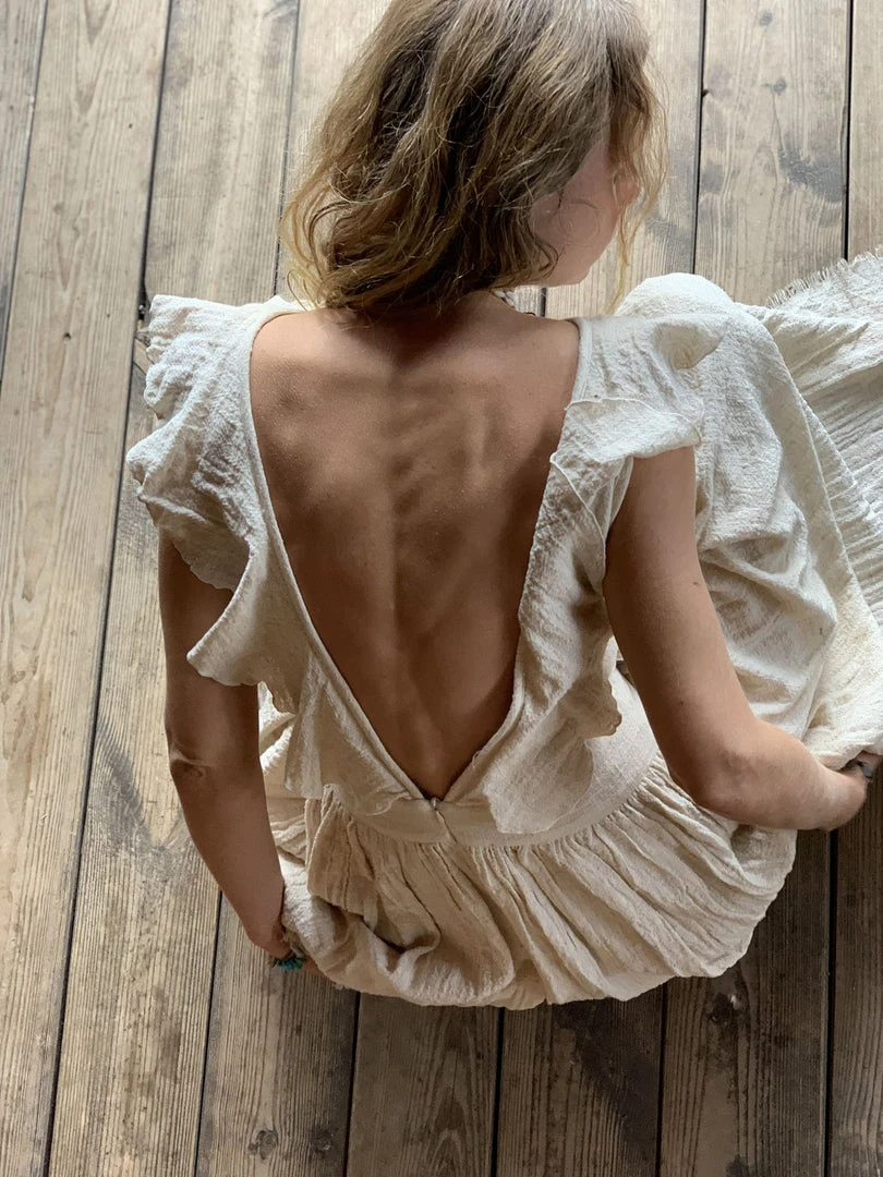 The deep V in the back is very flattering on many body types giving extra elegance, playfulness and romantic energy to your look.