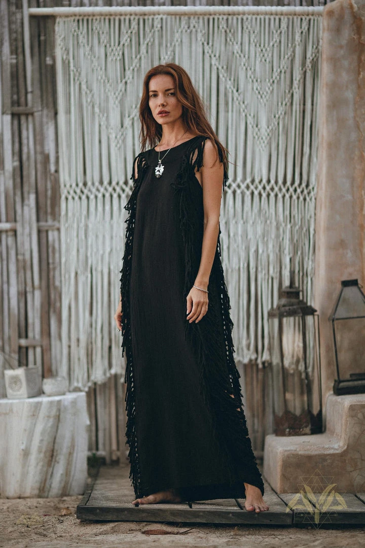 Bohemian Cut out Dress with hand loomed sides from top to bottom and an added tassels design. It is takes a few days to process this boho dress as it is entirely handmade by artisans at Bali Island. The treads hold tightly with knots one by one, which is making them very strong.