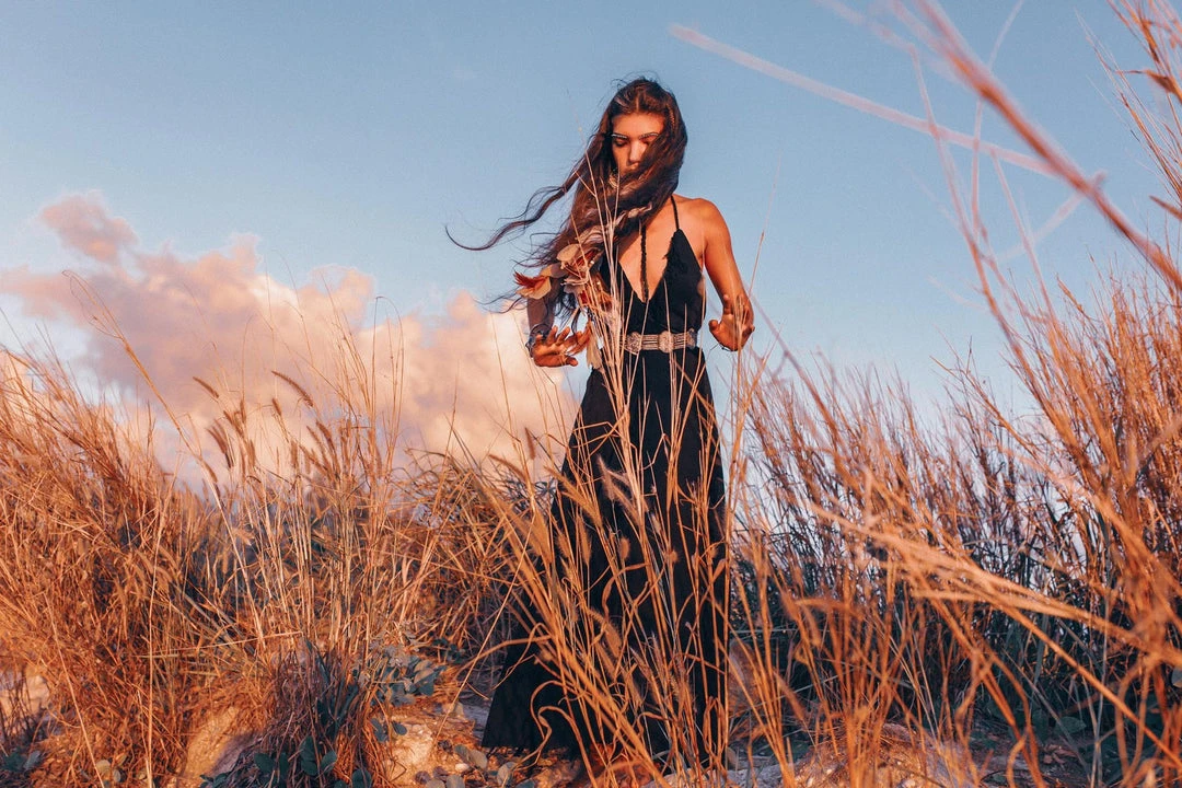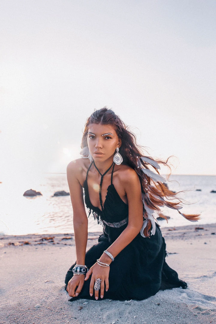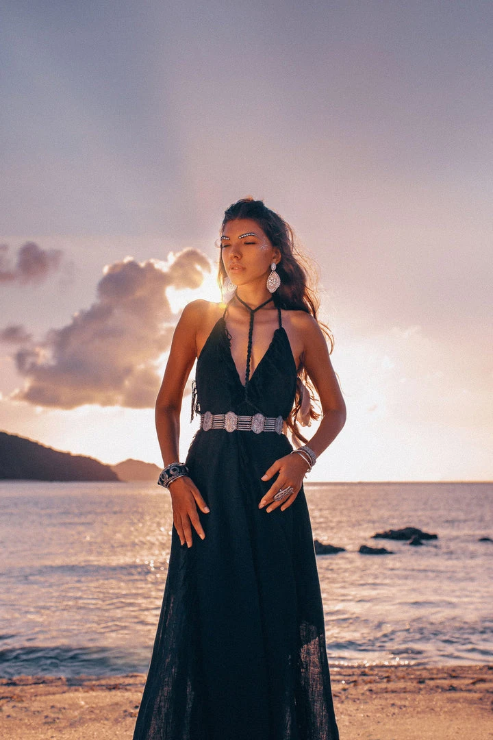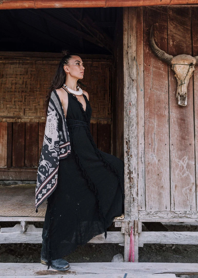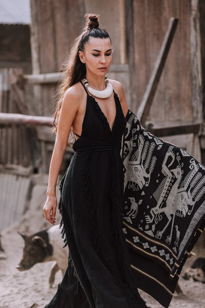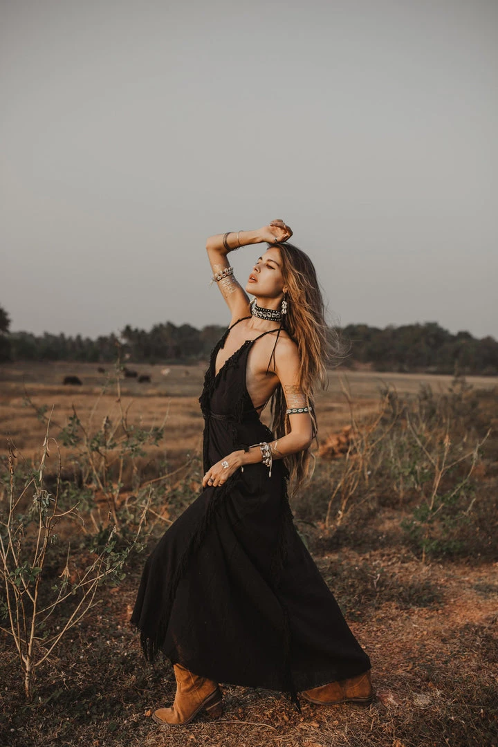 Our new stylish raw cotton black boho dress with hand loomed tassels is stunning and unique maxi slip dress. It was made by hand that can be seen in every detail which making this garment high fashion designer organic black wedding dress.
