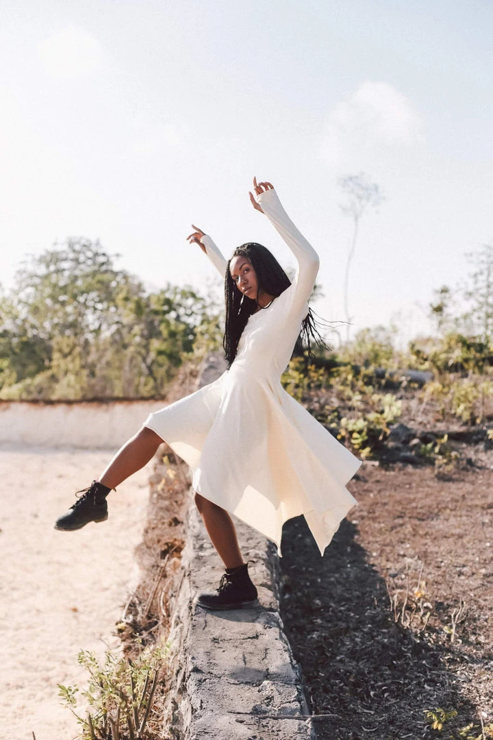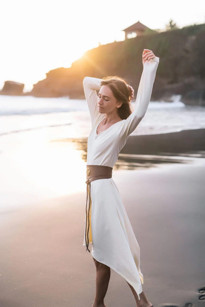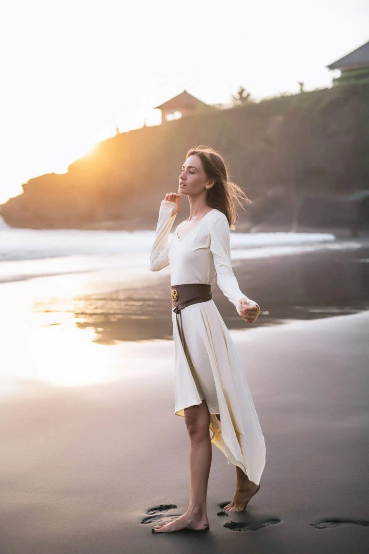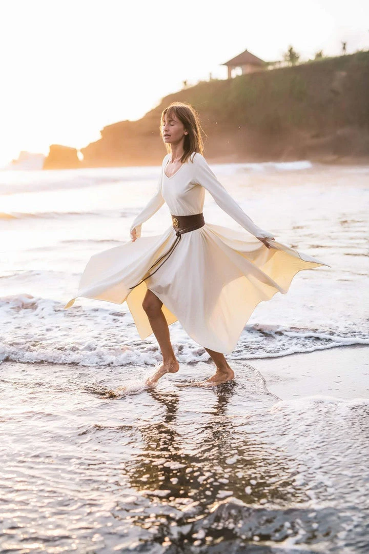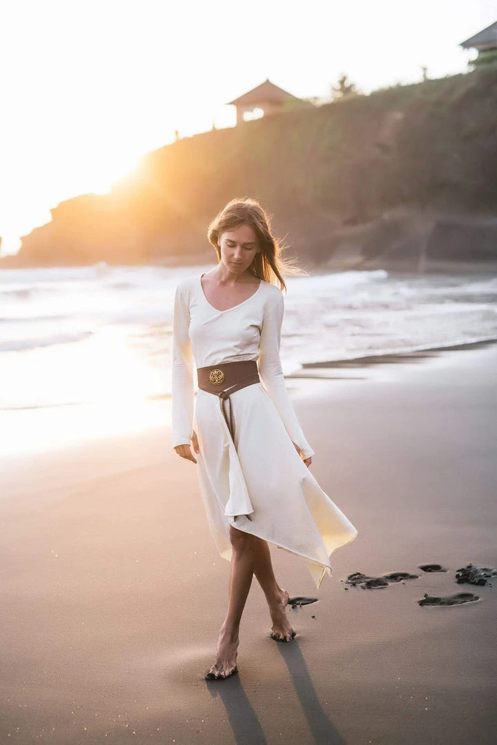 Comfortable long sleeve organic bamboo fibre white dress the best dress for a wedding, beach wedding, prom, or any special occasion or casual wear. A classic stunning fit, which is fitted at bust and waist, then floats out to a loose fit. Just enough flowy to be functional and flattering. The neckline is simple, flattering and modern with a slim roll of fabric all the way around. This will be a wardrobe staple for sure.