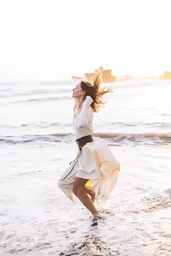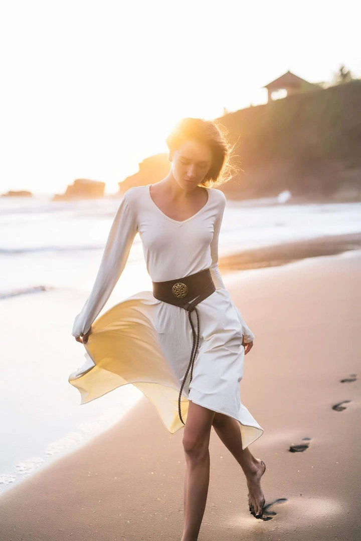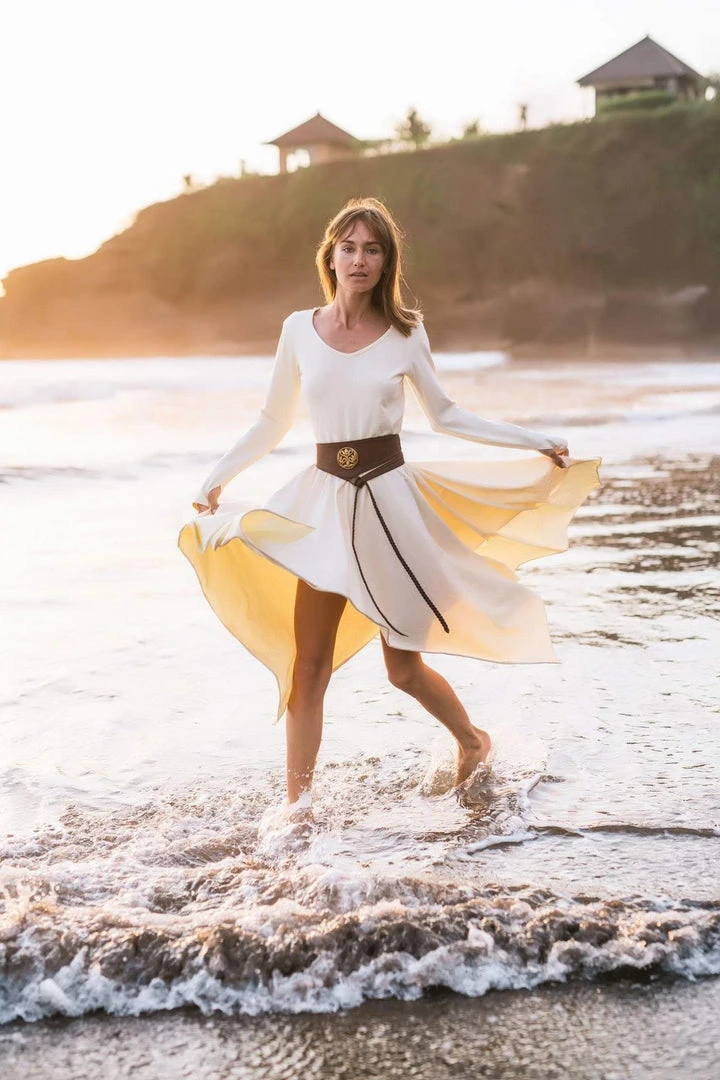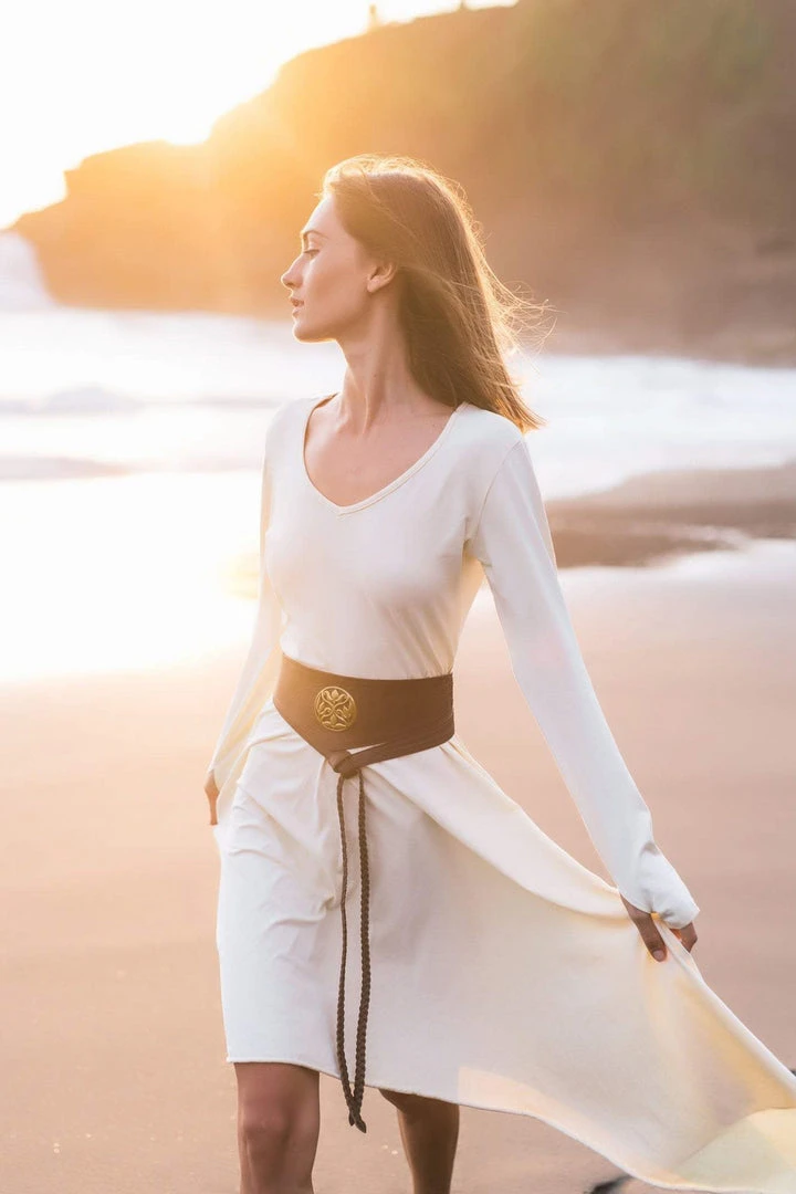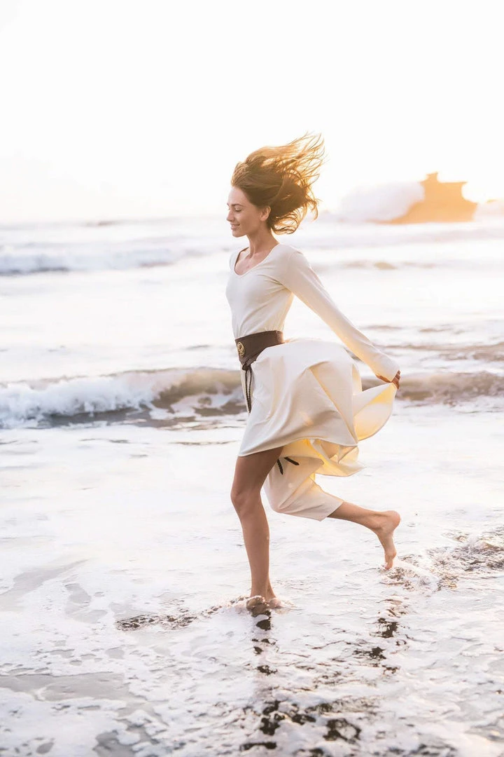 Comfortable long sleeve organic bamboo fibre white dress the best dress for a wedding, beach wedding, prom, or any special occasion or casual wear. A classic stunning fit, which is fitted at bust and waist, then floats out to a loose fit. Just enough flowy to be functional and flattering. The neckline is simple, flattering and modern with a slim roll of fabric all the way around. This will be a wardrobe staple for sure.