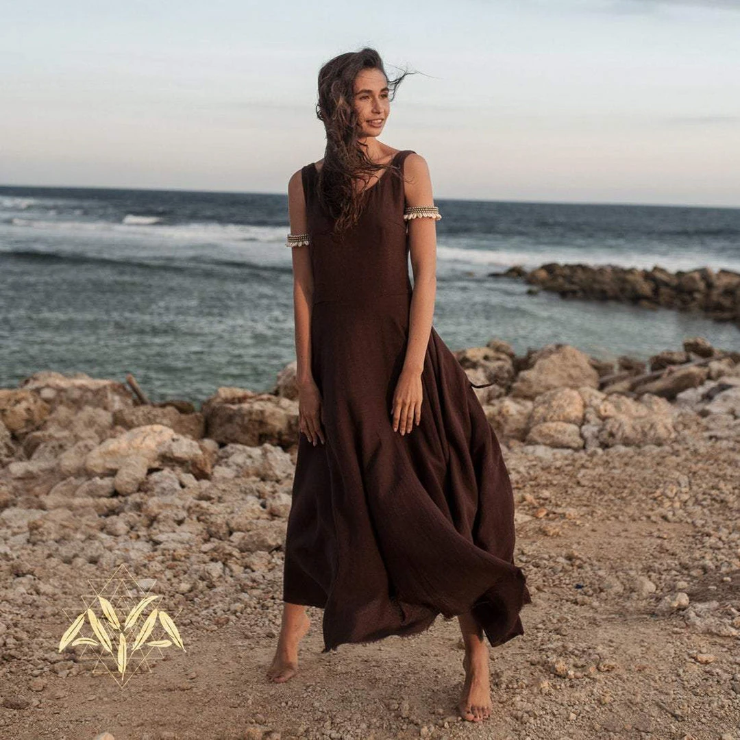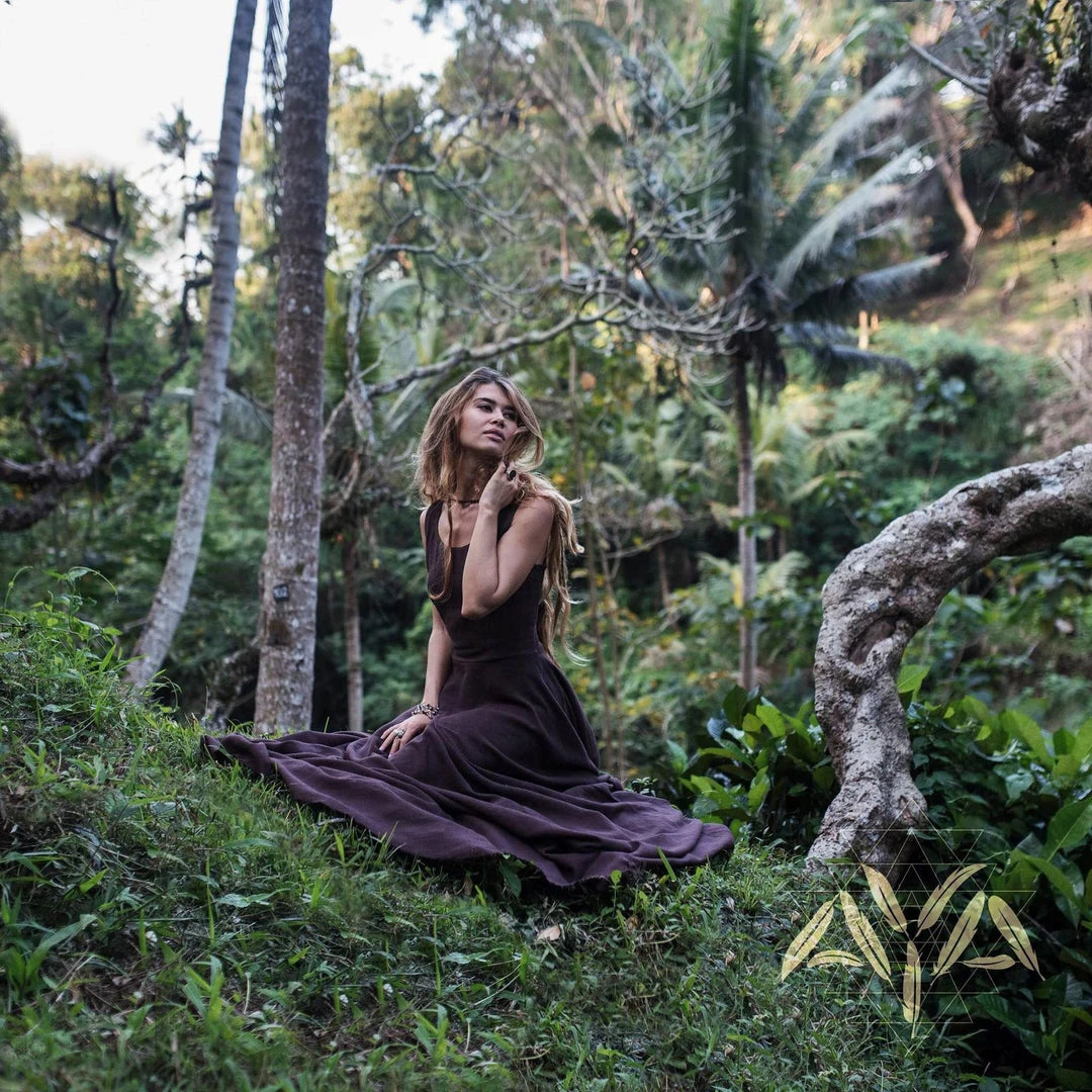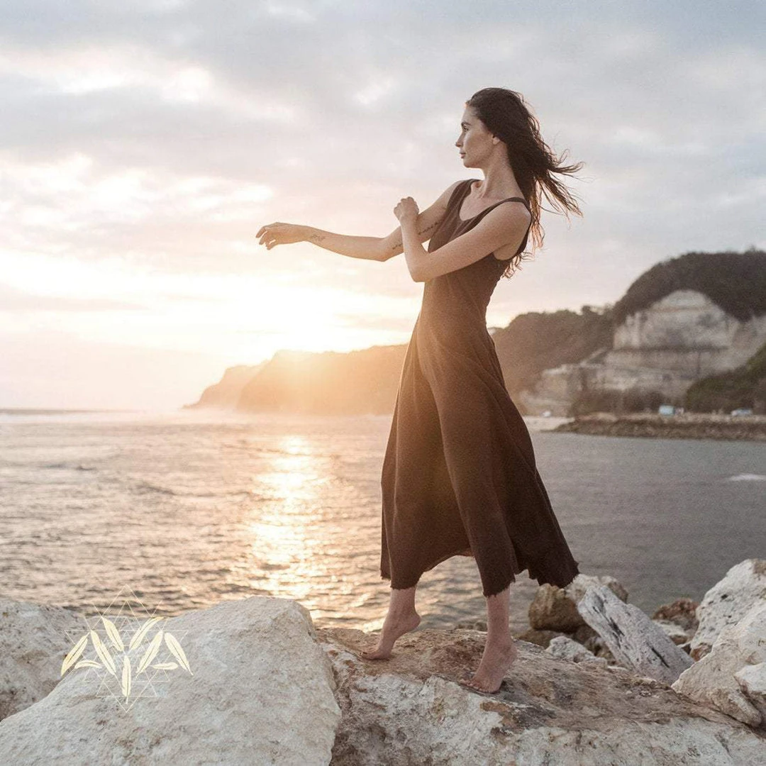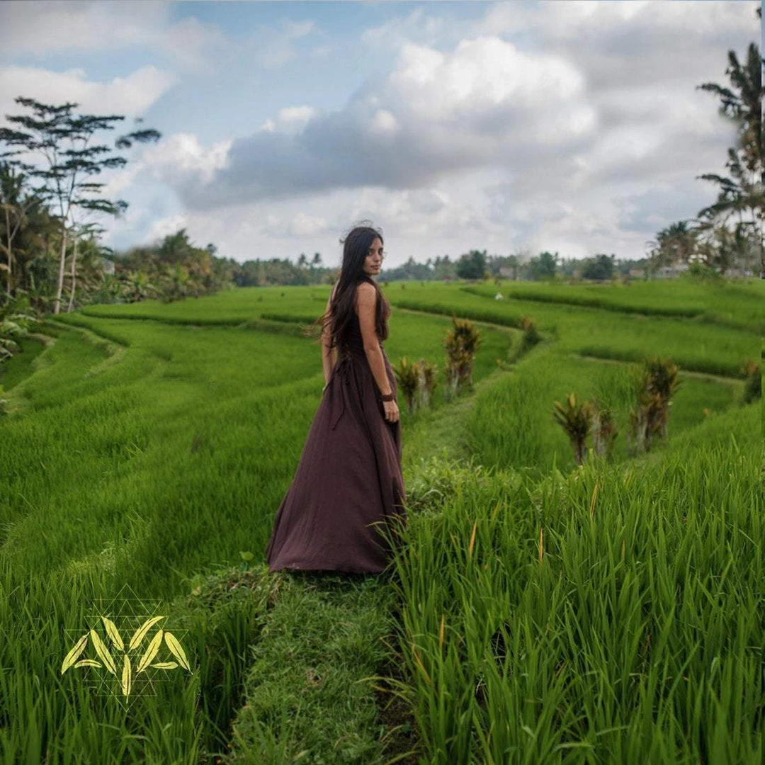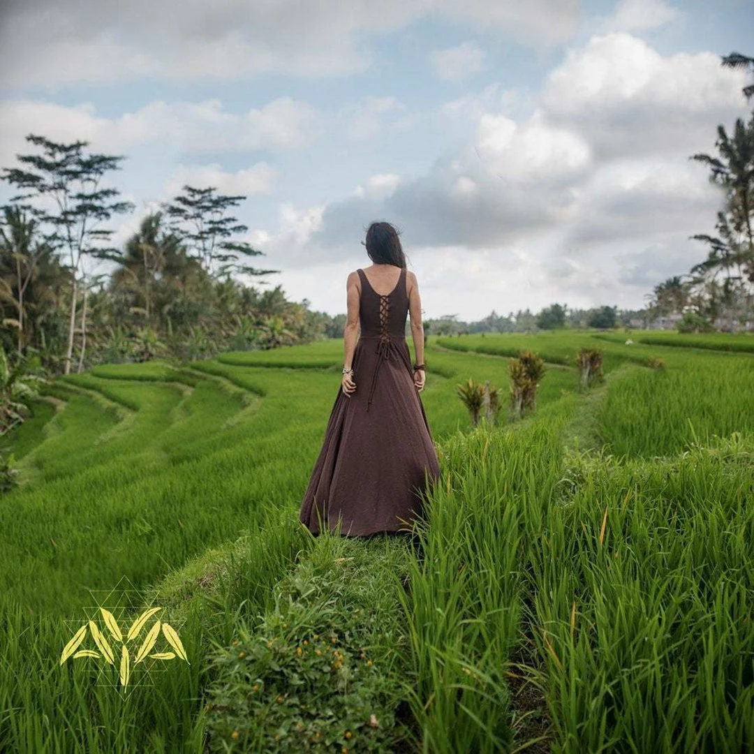 Our Goddess Long Maxi Dress is made of 100% raw organic cotton and designed to be breathable, flowing and comfortable. The back has a large opening with strings that you can adjust for your desired look. If you are looking for a long goddess dress that is elegant and comfortable, our “Madre Tierra” organic cotton maxi dress will do the trick.