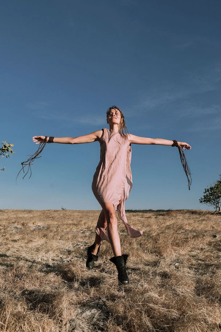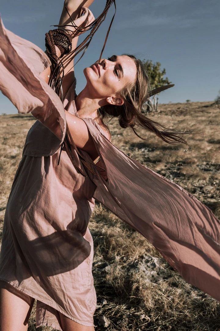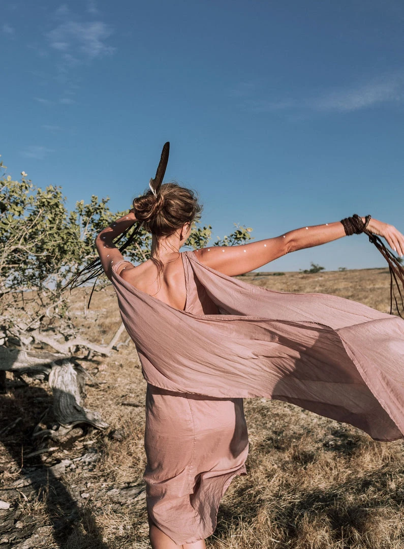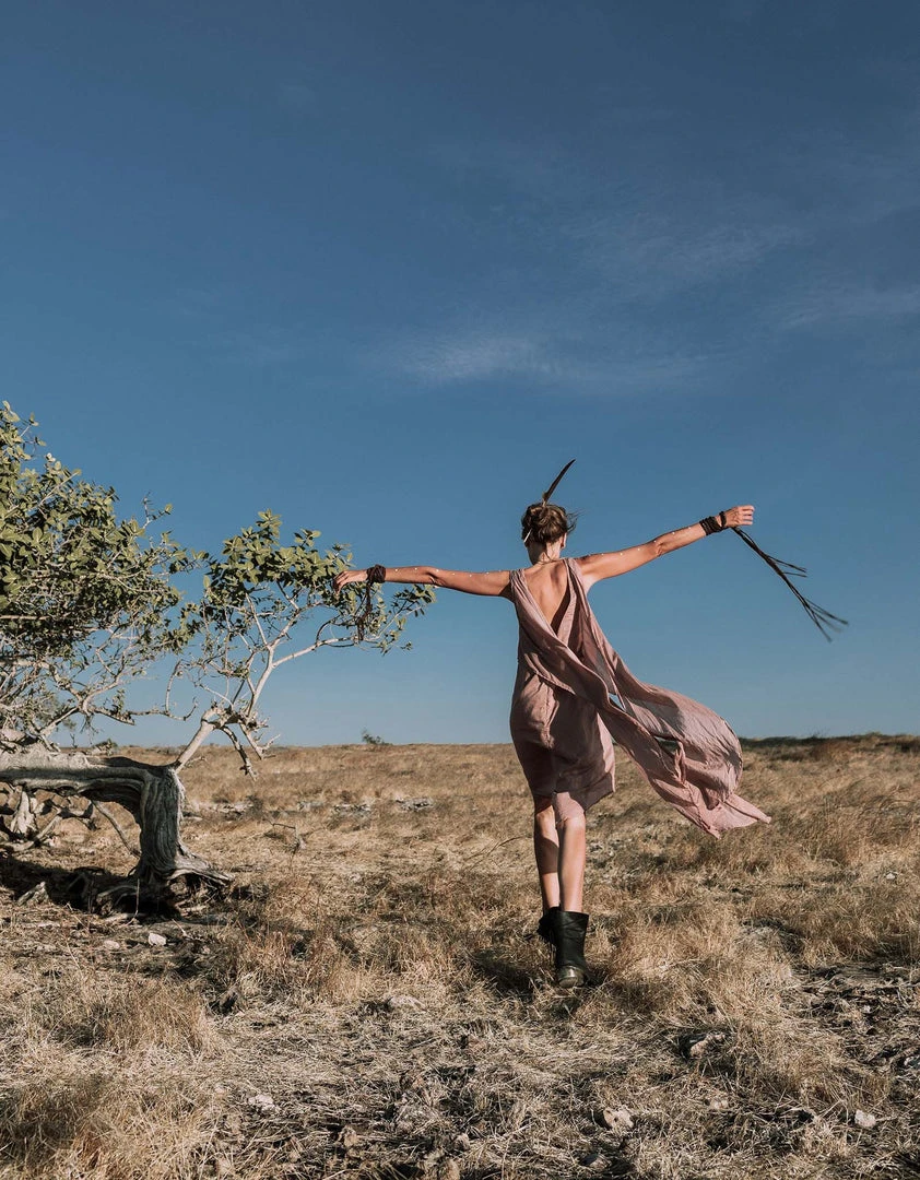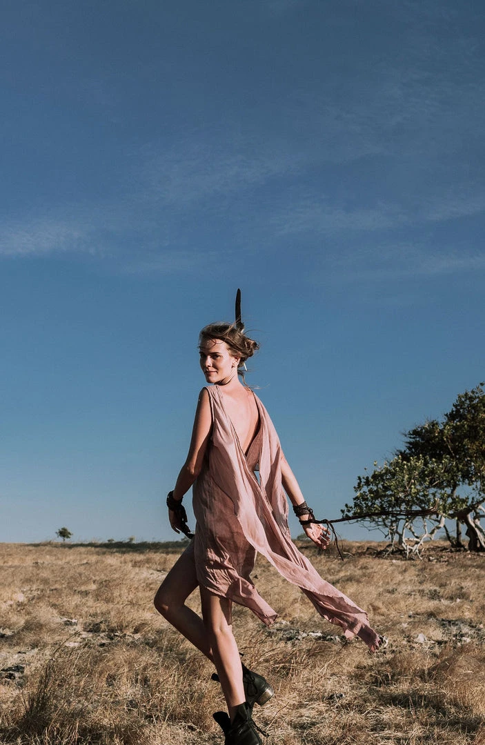 Our multiway convertible dress is a truly goddess dress, it can be worn in two ways, turned around the waist or folded into a wide belt at the back. It’s light and airy, made of the softest organic cotton and feels like you’re wearing a cloud.